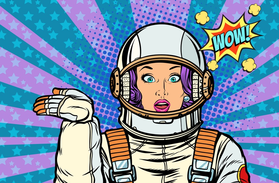 astronaut surprise woman presentation gesture